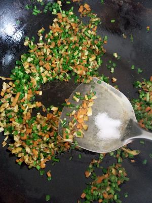 接着放入少量的盐,翻炒均匀,盛出放凉。