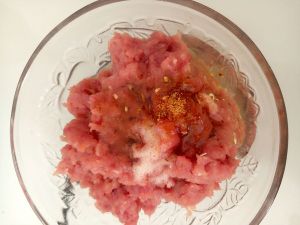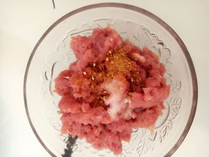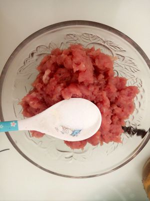 放凉之后倒入搅好的五花肉里面,搅拌均匀。