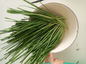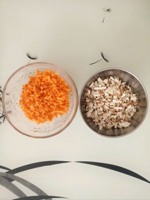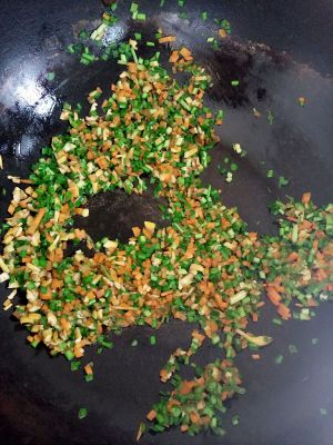 韭菜切碎,热锅热油,倒入韭菜香菇,胡萝卜丁翻炒。