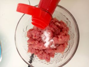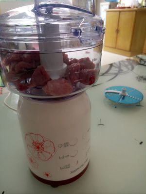 五花肉切稍微大一点儿的片儿,放入料理机里,按绞肉键。