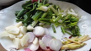 青蒜和香葱洗干净切段备用;姜和蒜切片,葱头切丝备用。