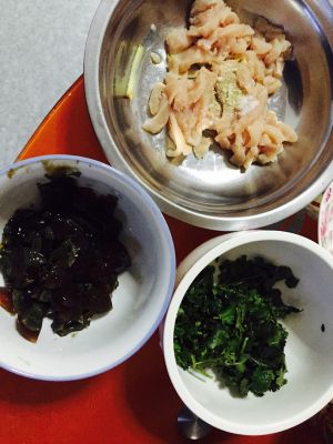 没有瘦肉就用了鸡胸肉,也很好吃。将鸡胸肉切丝,用开水多洗几遍,水挤干净,用姜丝,盐,白胡椒粉腌制。皮蛋切丁,香菜香葱切末备用。