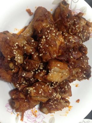 开火,倒入一平底左右的油,放入排骨翻炒至排骨表面见金黄色捞出备用,放入调好的番茄酱汁,小火炒至冒泡,倒入排骨,大火翻炒至排骨和酱汁全部融合,收汁出锅,撒上芝麻,完美~~