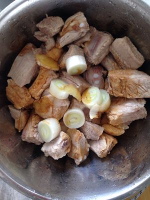 焯水去掉浮血,加入葱段姜片,少许料酒酱油调味去腥,放入电压力锅选肉类档炖40分钟左右
