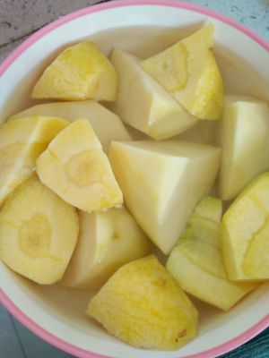 将土豆和胡萝卜削皮,切滚刀块,土豆比胡萝卜切大一点(防止煮烂)切好的胡萝卜和土豆泡水备用