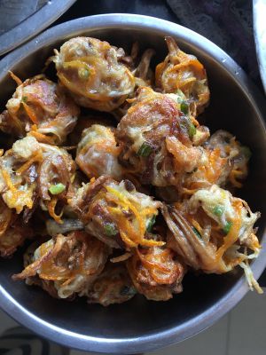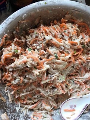 胡萝卜白萝卜擦丝用盐泡出水,然后把水倒点用清水冲一遍,然后加入面粉,葱,鸡蛋,还有各种调料搅拌均匀,如果太干了可以加点水