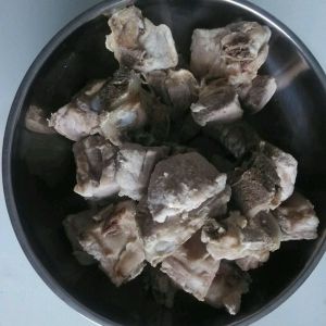 排骨切块洗净,烧开水放入排骨,撇去上层浮皮,排骨捞出沥干,放置备用