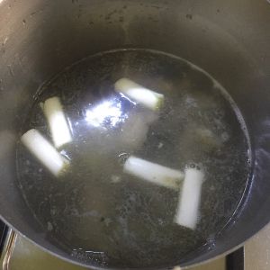另起一口锅,将煎过的排骨放入锅中,加入适量开水,加入姜片和葱段,倒入醋和料酒~小火炖煮一小时~