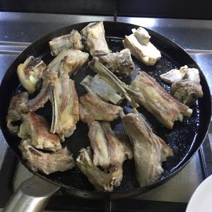 将排骨捞出控水,热锅倒入少量油,将排骨小火煎三分钟~