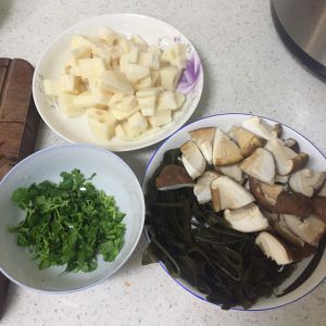 将排骨洗净,冷水下锅,放入两片姜,煮开去血水~莲藕、香菇、海带和香菜洗净切块备用~