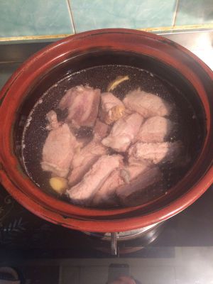 排骨冷水下锅,加入料酒、生姜 煮滚后,排骨捞出清水冲干净放入炖锅