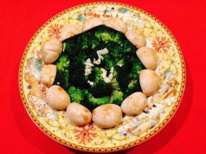随后放入白蘑菇大火煸炒,加入适量蚝油,基本就可以不加盐了。盛出后摆在西蓝花四周。