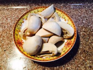 白蘑菇洗净后一切为二。