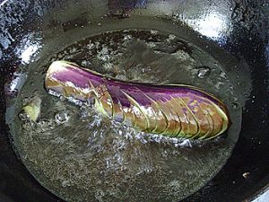 起油锅,茄子放入炸熟捞起。炸完后的茄子要放到开水中“飞水”,以去掉多余的油份。飞完水后,将茄子捞起,沥干水分