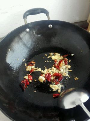 锅中留底油 蒜末和干辣椒扔进去炒香