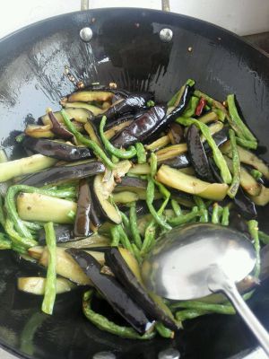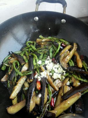 过好油的茄子豇豆扔进去翻炒片刻 倒入生抽 耗油