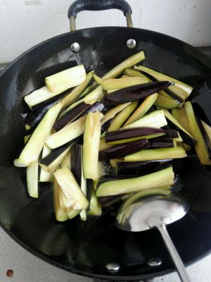 把茄子过油炸熟,待茄子稍微上色倒入配料稍烫然后捞出备用。
