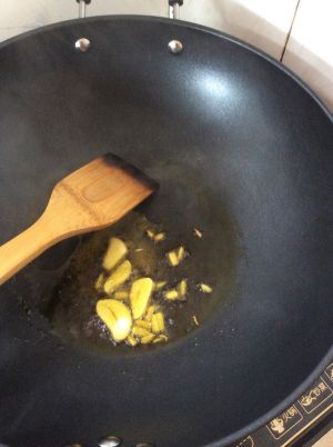 锅烧干,放油,炸香蒜片姜丝。(蒜片姜丝留点不要一次性放完了)蒜片姜丝出香味后捞出!(切忌要捞出,因为蒜片姜丝出味了也炸至快黑了,不好看)