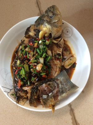 出锅的时候撒上葱花。呵呵我的碗比较小放不下了。(我的鱼从来不放鸡精味精的,妈妈说败坏了鱼本身的鲜味)