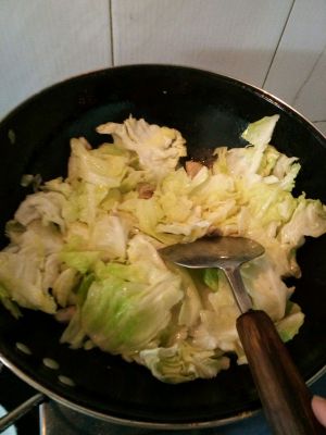倒入包菜根翻炒,等软了之后,倒入包菜叶继续翻炒