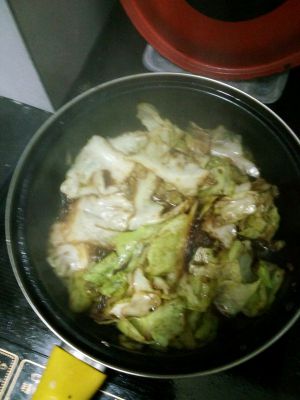 3、放入卷心菜,翻炒几下,稍变软,放入陈醋,继续炒,直到熟。