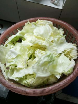 包菜去根撕块,淡盐水浸泡15分钟,洗净沥干备用