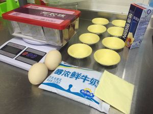 蛋挞皮是现成的。调蛋挞水就是把淡奶油和牛奶和白砂糖搅匀后,加入蛋黄,筛入低筋面粉。再一起过筛调制成蛋液。