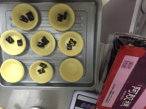蛋液倒入蛋挞皮8分满,入烤箱,220度上下火
