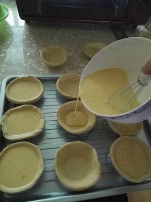 将鸡蛋液倒入蛋挞皮中放入烤箱烤下就可以了,搭配牛奶或者果汁都是不错的早餐