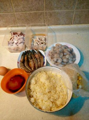 菠萝切1/3,挖出菠萝肉待定使用!准备虾油:锅中倒入食用油加入草虾的(3-4)虾头,大火翻炒出虾油,油飘出鲜香的虾味即可。口蘑和鱿鱼用热水烫煮6分熟备用。准备好酱料:把材料中的番茄酱+蚝油+糖+白醋+适量清水,米饭用一个鸡蛋混合搅拌好,草虾整理干净去虾线!