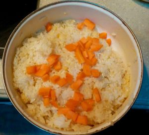 炒米饭,锅内倒入少许虾油打入另一枚鸡蛋,微微熟盛出待用,继续锅里倒入少许虾油,米饭翻炒3分钟,米粒均匀摊出,加入胡萝卜丁和葱花碎翻炒,加入一勺椰浆和菠萝汁混合汁液倒入锅中,翻炒3分钟,米饭8成熟盛出备用