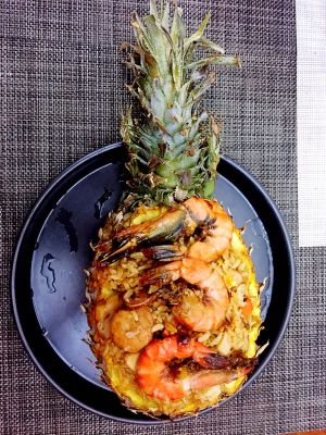 把炒好的三鲜菠萝饭加入之前挖好的菠萝里,烤箱预热200度烤14分钟,逼出菠萝的香味