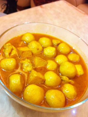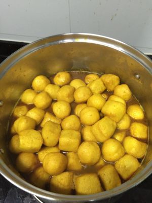 加适量水倒入鸡汤或肉汤(鲜味全靠它,只有咖喱会很涩),放咖喱粉和咖喱膏,加少许鸡粉和盐,量看个人喜好,水煮沸后放入鱼蛋和鱼腐,煮至鱼蛋膨胀并浮起。