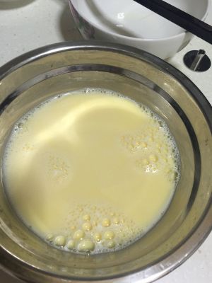 加热后的牛奶要彻底放凉,倒入鸡蛋液中。