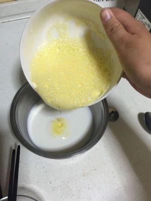 将蛋液倒入溶了糖的牛奶中