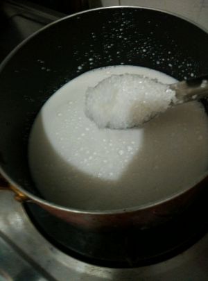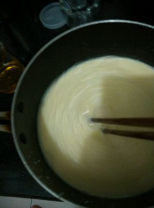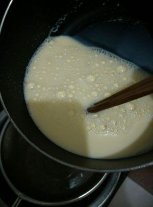牛奶加糖,炉子上加热到糖融化。加热到60-70度关火。