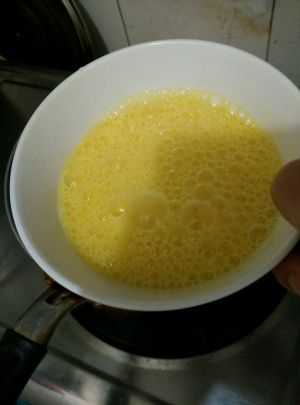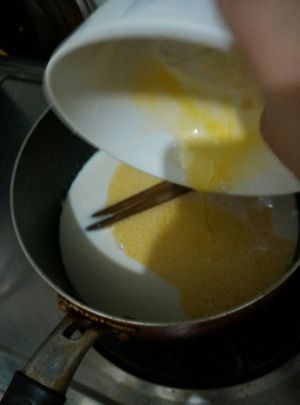 等牛奶液冷却到常温,倒入至打散的鸡蛋液中容器中搅拌均匀。