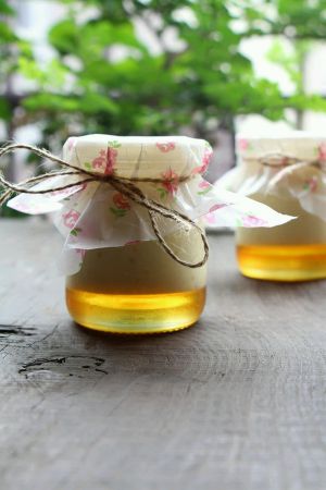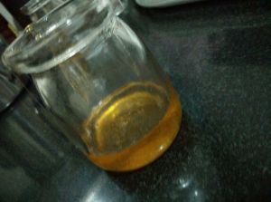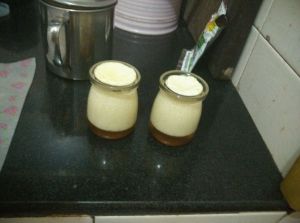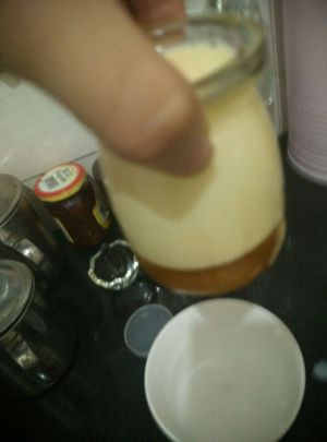 乘热将焦糖液倒入事先准备好的瓶里。将瓶子稍微摇均匀,一会冷缺后焦糖就凝固了。家里瓶子不够,我用了家里其它小瓶子代替。