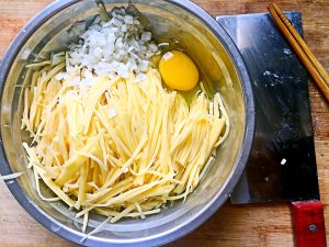 土豆刨丝,加黑胡椒,盐,鸡蛋,面粉