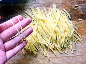土豆切丝,手切,吃起来味道更好哦~不要用水泡,不要洗去淀粉,千万不要!淀粉会增加土豆丝的粘性,有助于成型!