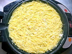 电饼铛倒入适量花生油,把搅好的土豆丝倒入电饼铛,摊开,10分钟左右看下好没好,自行调整。我家电饼铛是单面的,我还得很费劲的翻一下。双面电饼铛省事,记得烤的时候饼的上面也稍微刷点点油。