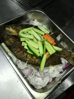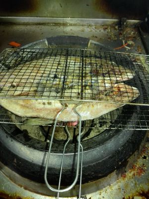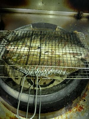 腌制6小时候,清洗一下鱼,上炉灶,烤 如图所示