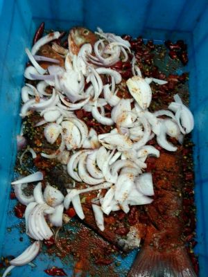 用洋葱,生姜,白酒,干辣椒,花椒,盐。注意 盐和花椒,辣椒需要在锅里炒热,出香味,腌制6小时