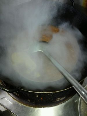小锅放少许油,加入切好的豆瓣酱,炒出红油。再加入蒜、姜、香菜末,炒出香味后,加水煮沸。