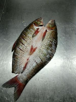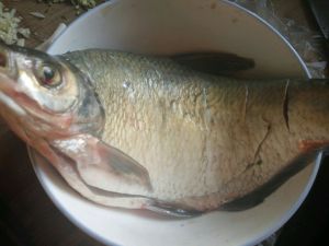 去鳞去腮内脏,一批两半,实在怕切手,妹子们可以改个花刀吃正鱼也是可以的,然后抹盐,倒黄酒入味