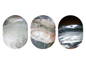 在另拿一平底锅锅,在锅上刷油,将锡箔纸包好的鱼放入锅内(有皮的那面朝下)煎10-15分钟。煎好后,将锡箔纸打开,那着锡箔纸将鱼翻一面后,慢慢的将锡箔纸掀起