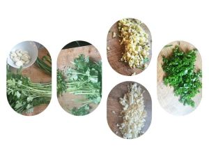 1准备好配料。2香菜对半切,茎切末。3姜切末。4蒜切末。5香葱切末。