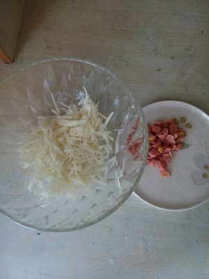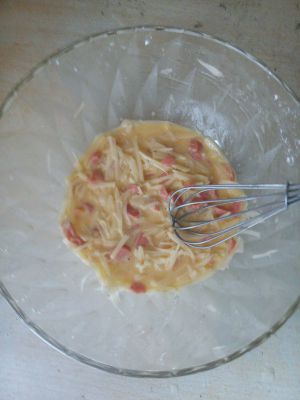切好的土豆丝和火腿肠放在一个大碗里,加入鸡蛋和少许面粉,加入少许盐和鸡精,开始搅拌,觉得太稀了就再加一点面粉,不要太干了