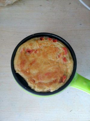平底锅烧热,加少量油,将搅拌好的原料放入锅内,摊平。盖上锅盖。