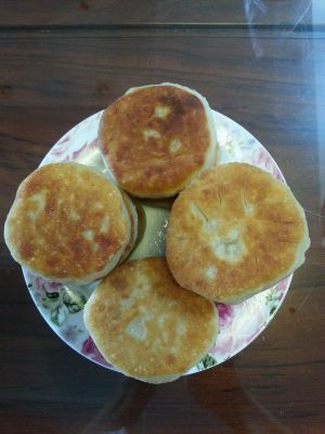 包好馅的饼放在湿毛巾里盖好,防止干皮。二十分钟后起油锅,放饼进去煎,小火,煎到两面黄就可以了。